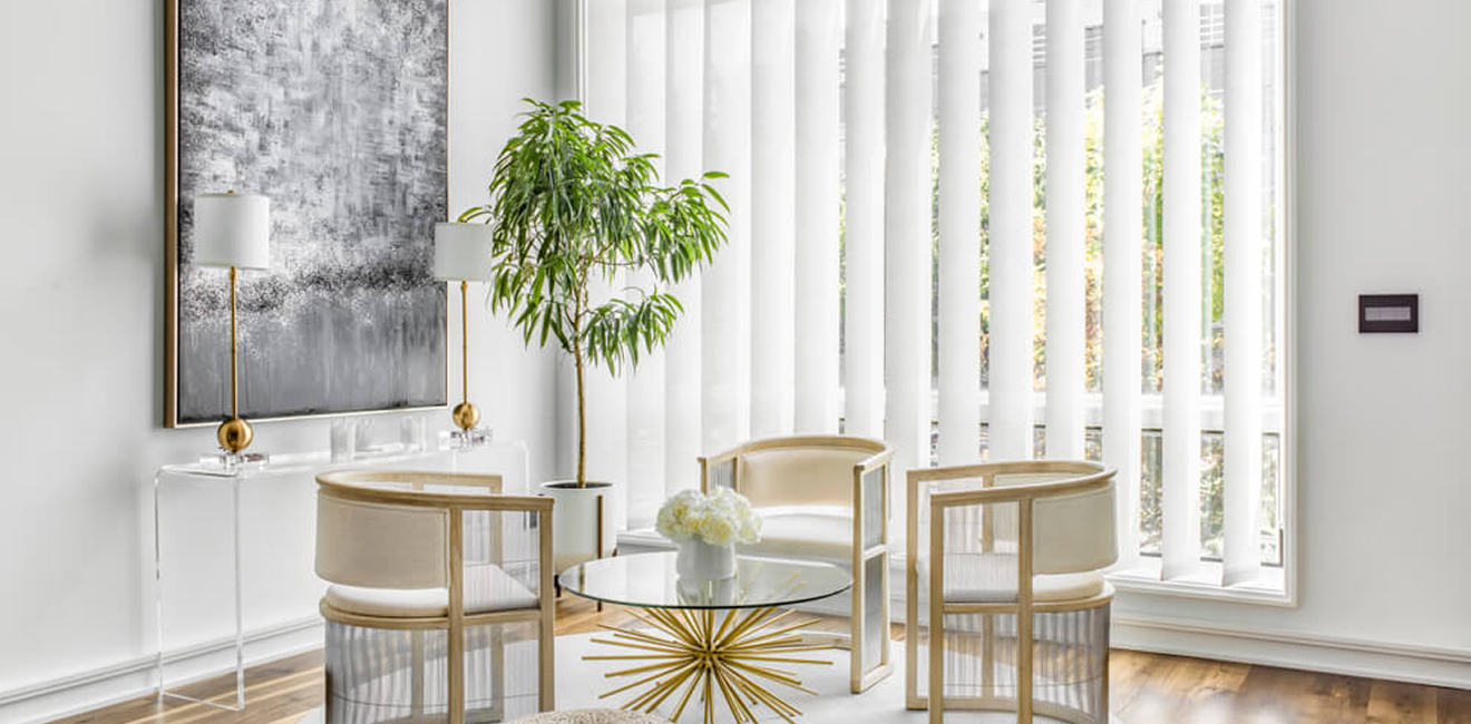 When entering the home, you immeditatley encounter a formal living and dining area where most people think, ‘ok - what do we do with this space? Are we ever going to sit here?’ With that in mind, we focused on creating a seating space that the client actually utilizes when entertaining, all the while making it cohesive with the dining area. Sculptural chairs surrounding a glass top coffee table with a starburst base are the focal point of the formal living space. Obviously, adding in some tall greenery was a must. We used the same rug material to ground both the formal living and the dining spaces - but mixed it up with contrasting shapes. Now, let’s talk about this window treatment for a sec. The clients requested privacy, but also wanted the ability to let light in and keeps things bright. These vertical solar shades are one of my favorite elements. They’re so architectural, and they also give crazy height to this already tall space.