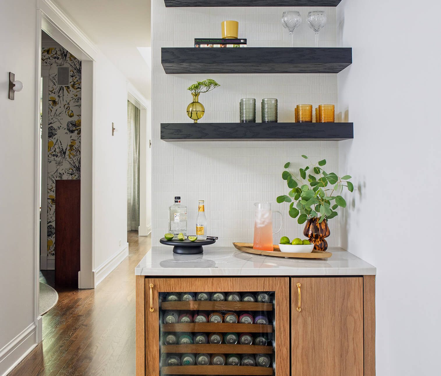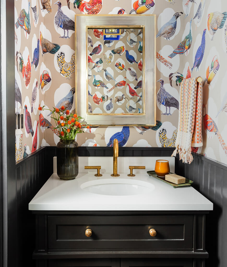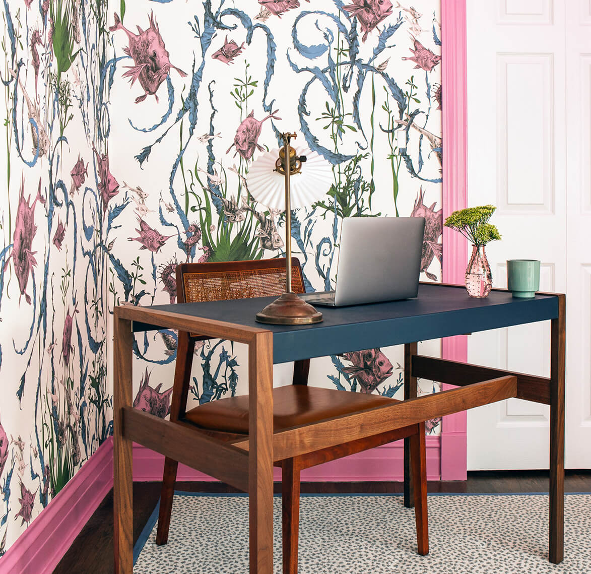 The standout “Rainbow Bathroom” features a custom concrete tile layout that creates a cascading multicolor effect—a joyful design moment crafted for the homeowners’ two teenage children. Equally expressive is the home office, designed for a plastic surgeon with a passion for needlepoint. Framed works of her art are thoughtfully arranged in a gallery wall above a pink sofa, surrounded by fish-patterned wallpaper, bold drapery, and a bespoke light fixture. Every room in this home reflects the family’s love of art, humor, and meaningful detail, resulting in a space that’s as curated as it is playful.