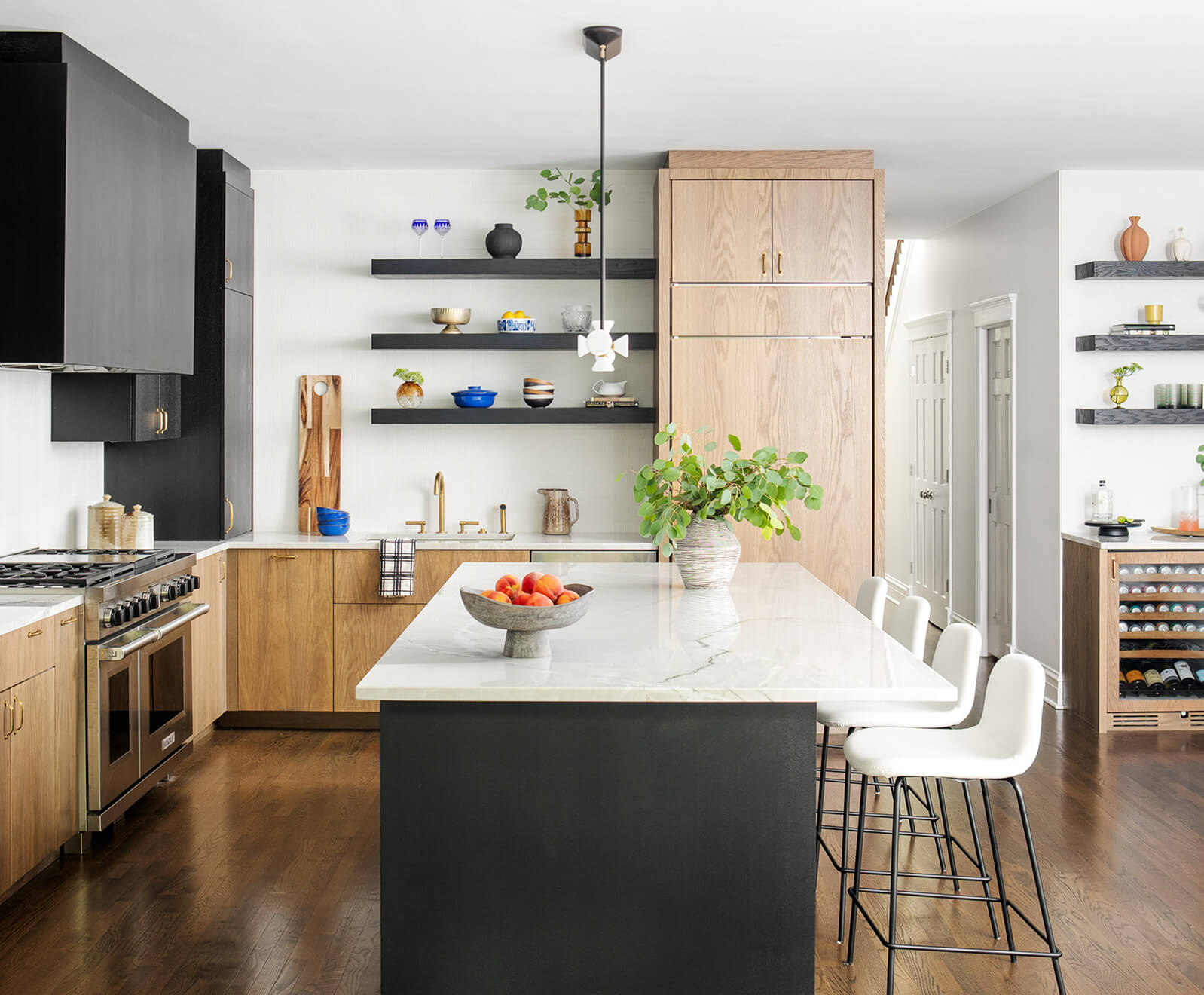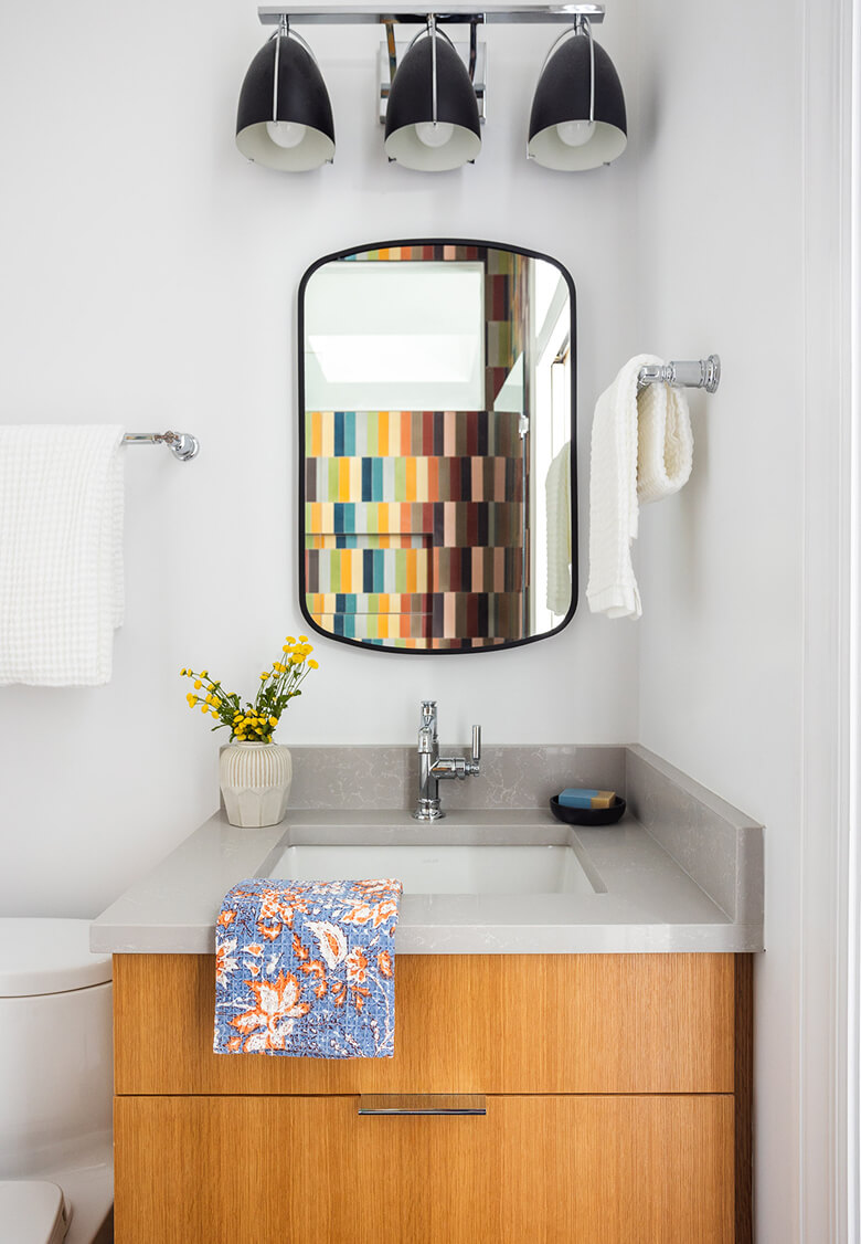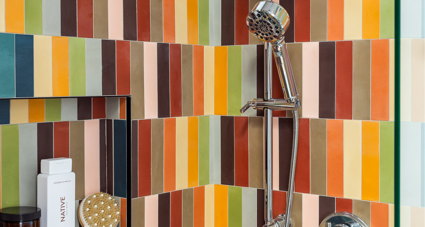 The standout “Rainbow Bathroom” features a custom concrete tile layout that creates a cascading multicolor effect—a joyful design moment crafted for the homeowners’ two teenage children. Equally expressive is the home office, designed for a plastic surgeon with a passion for needlepoint. Framed works of her art are thoughtfully arranged in a gallery wall above a pink sofa, surrounded by fish-patterned wallpaper, bold drapery, and a bespoke light fixture. Every room in this home reflects the family’s love of art, humor, and meaningful detail, resulting in a space that’s as curated as it is playful.