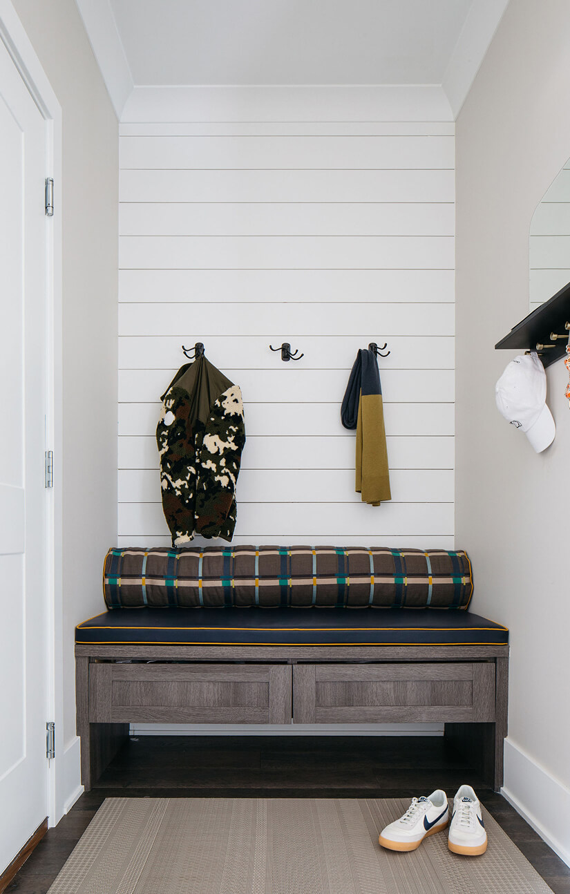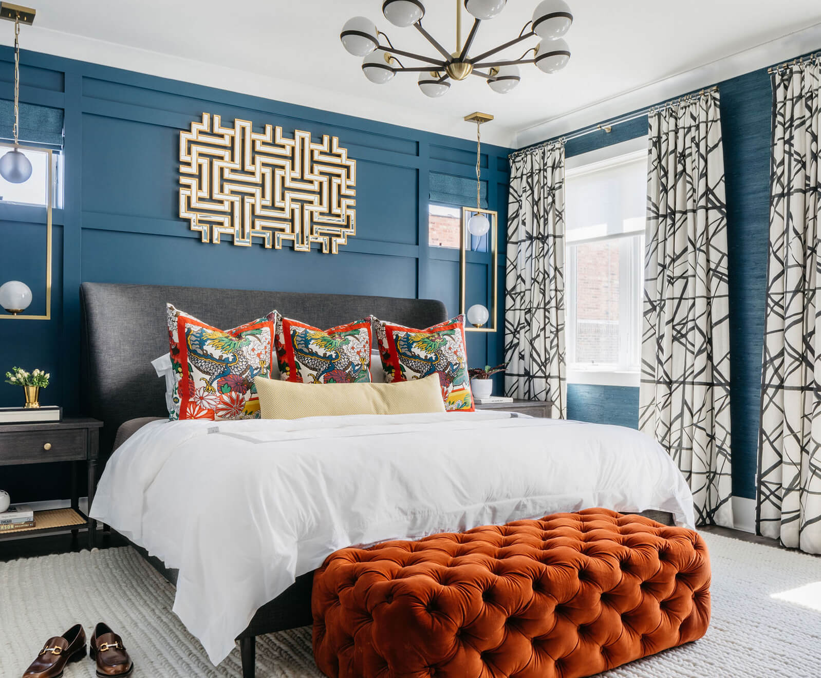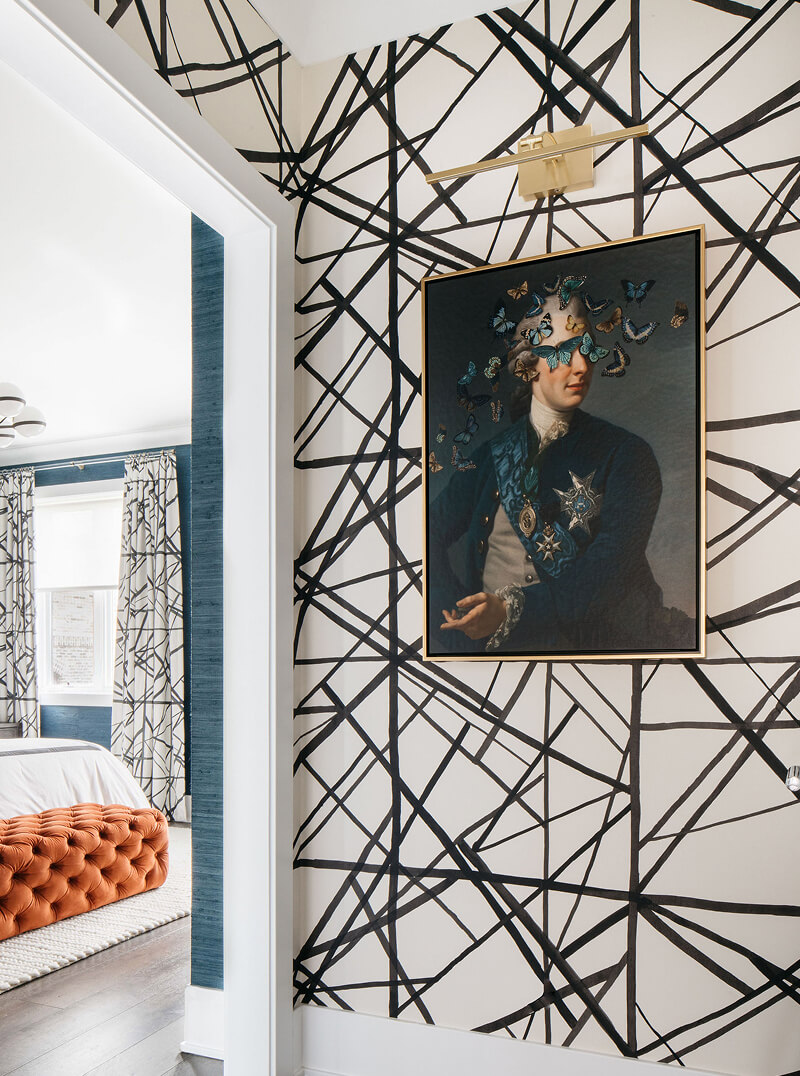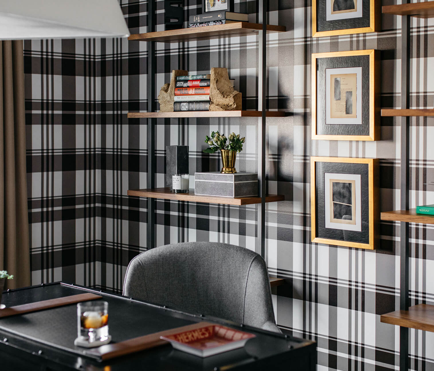Throughout the home, bold design moments are balanced with functional elegance. The guest bedroom plays with rich textures and color accents, while the office brings a tailored vibe with plaid wallpaper, mod-inspired seating, and a bar cart for a touch of retro cool. The open living and dining area features deep teal walls, a custom wet bar with tinted glass shelving, and sculptural lighting over a round table with custom-upholstered chairs. Outside, the terrace offers an urban escape with lounge seating, layered planters, and a fresh palette that ties the whole home together in cozy, elevated style.