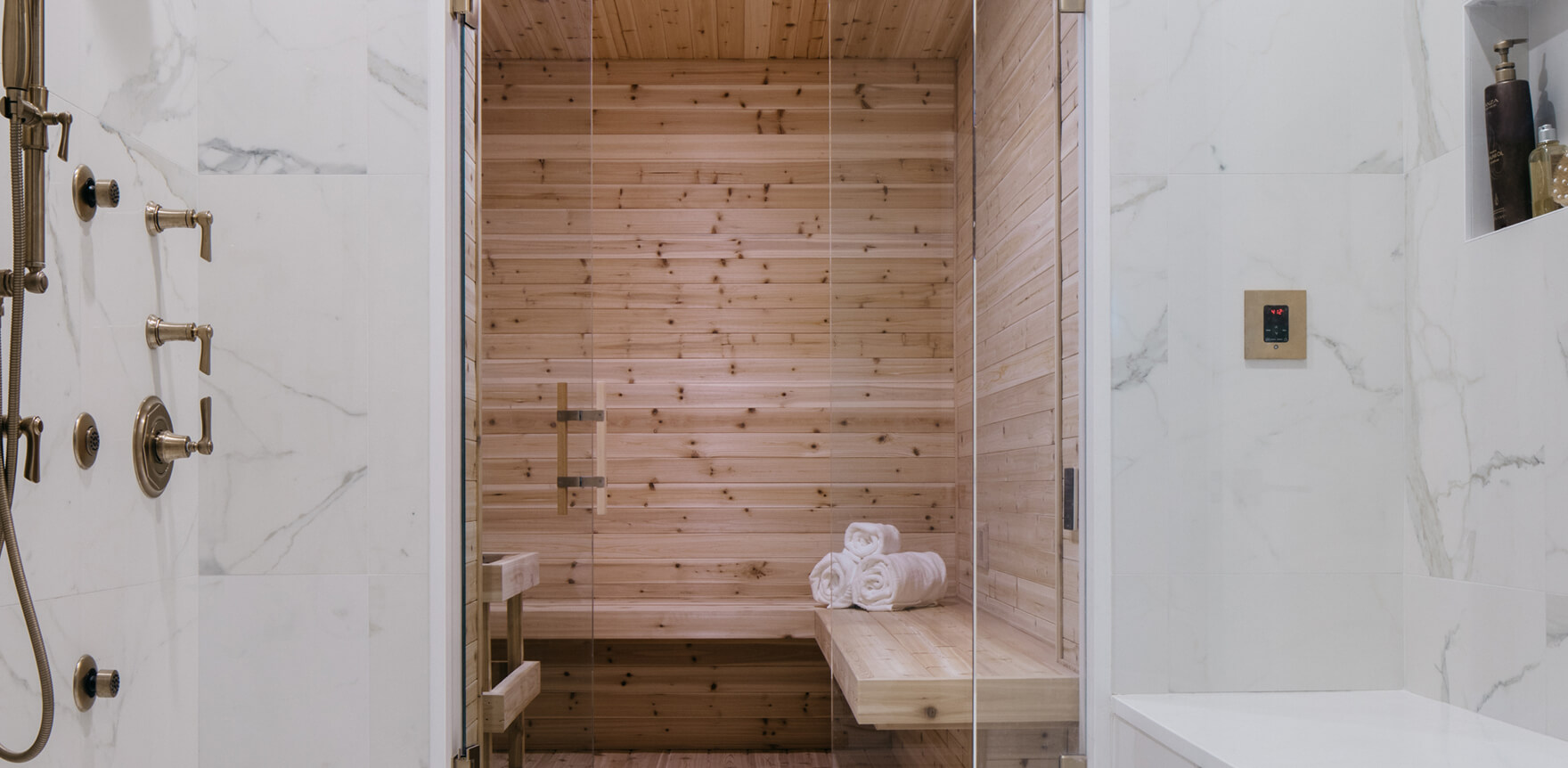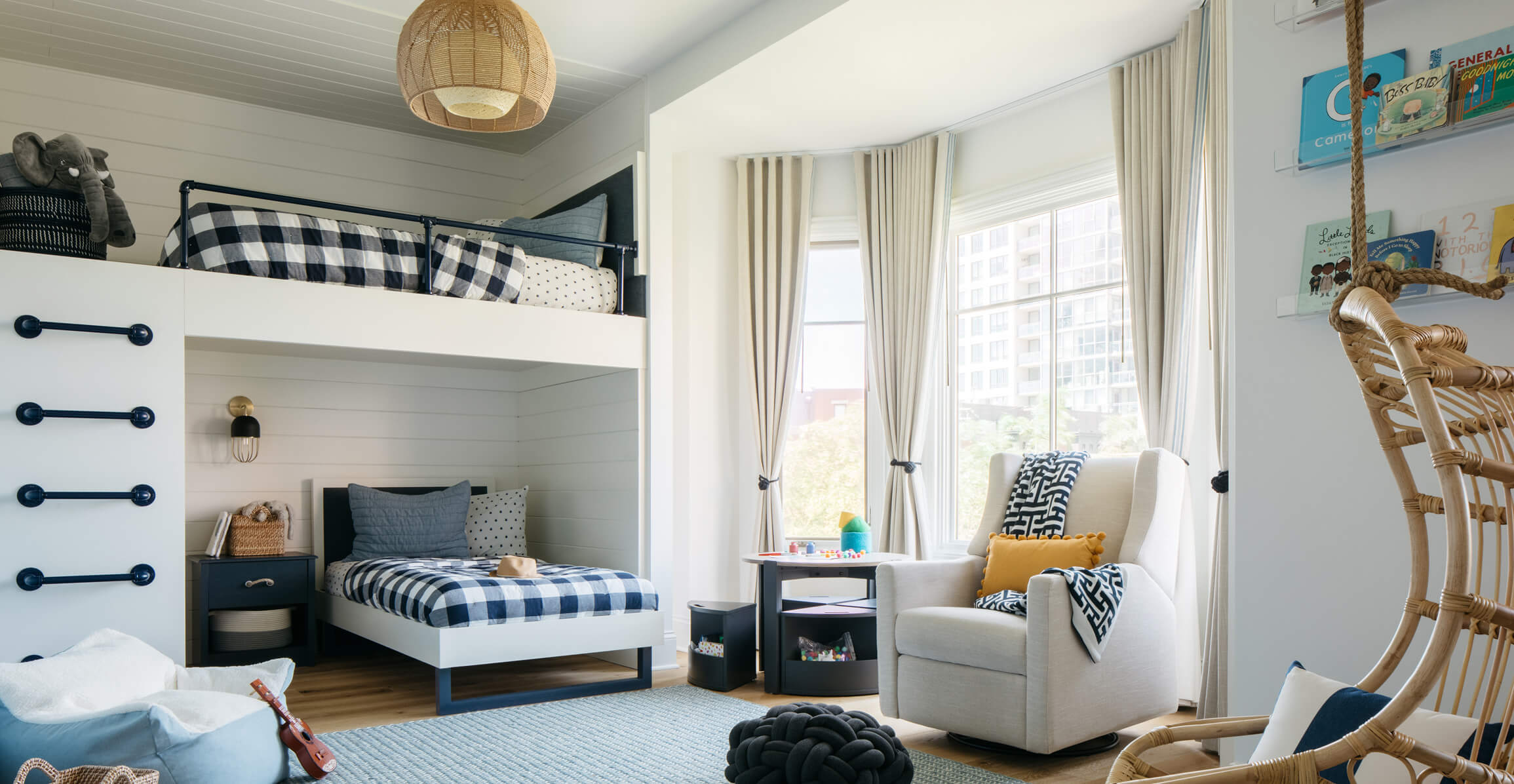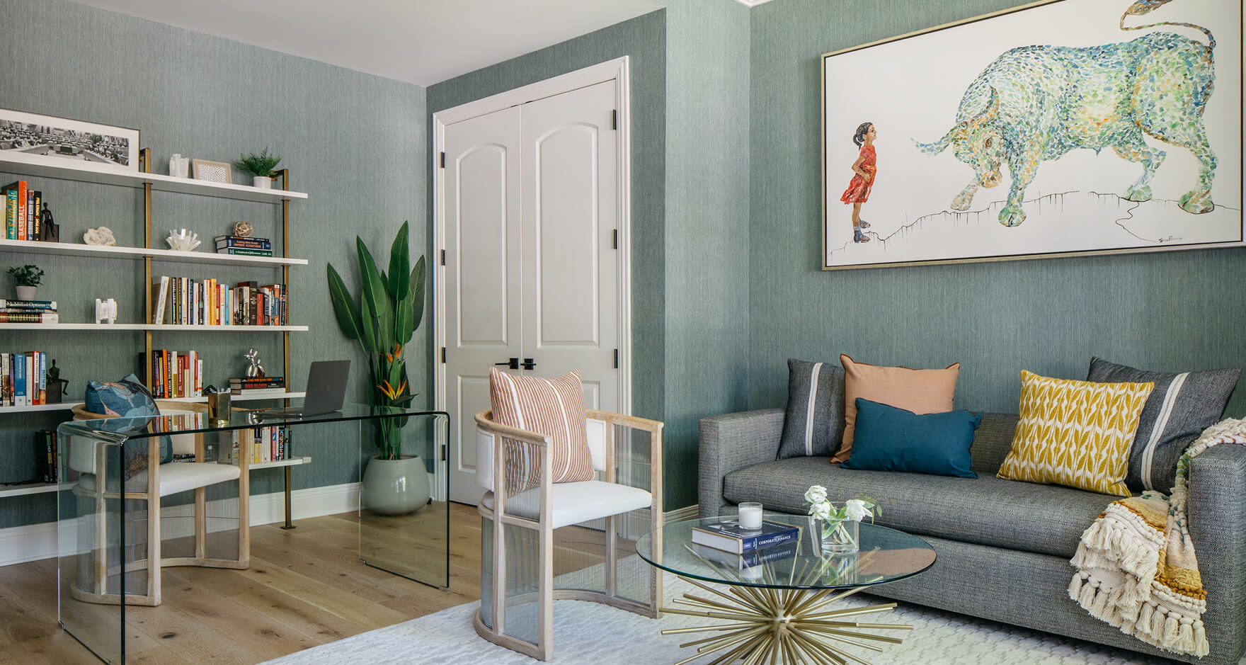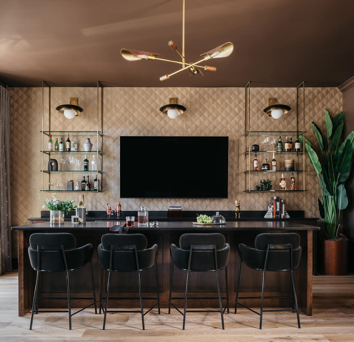 Each level of the home offers its own experience—from the serene primary suite and playful children’s rooms to the moody top-floor lounge that shifts into an Art Deco-inspired hideaway. The home office channels bold energy with rich green wallpaper and colorful accents, while the terrace, accessed via a NanaWall, becomes an extension of the main living space. Every room was designed with purpose, whether it’s the cheerful custom bunk bed for the kids, the spa-like primary bathroom with sauna, or the perfectly composed entry that sets a welcoming tone. The result is a layered, livable home that feels tailored to its residents in every way.