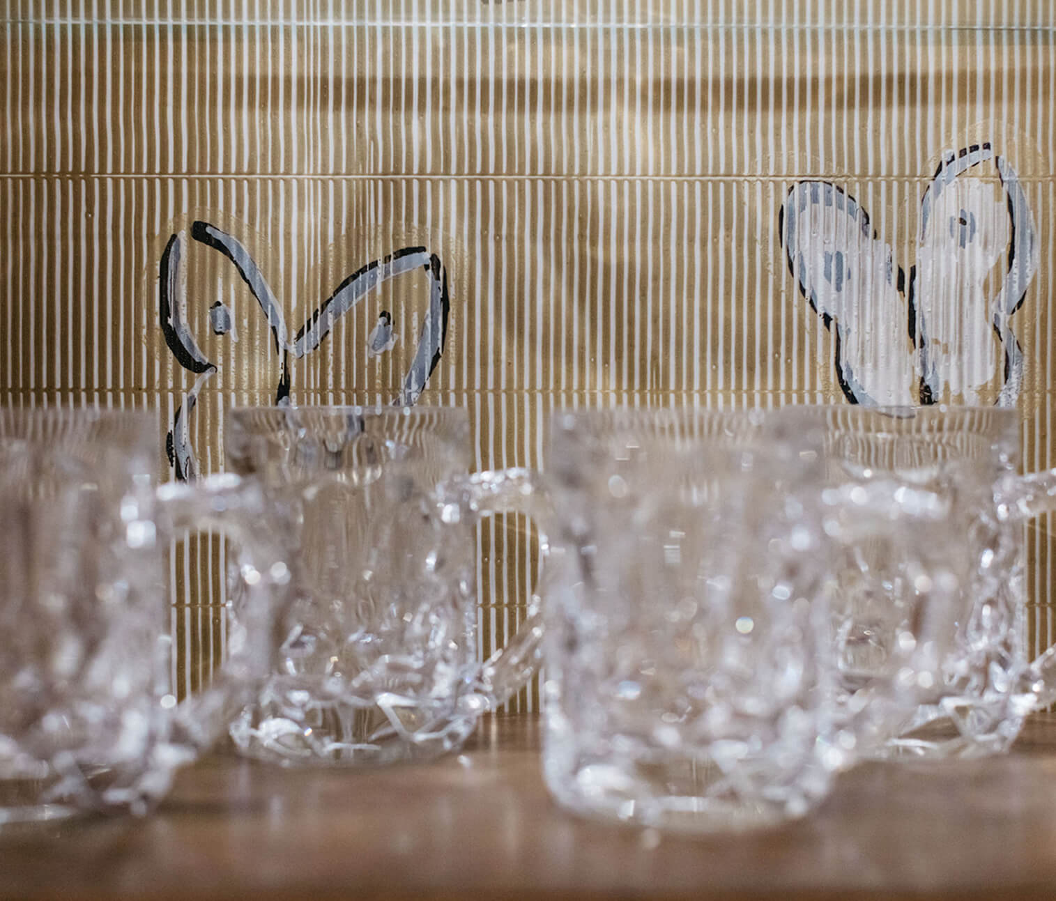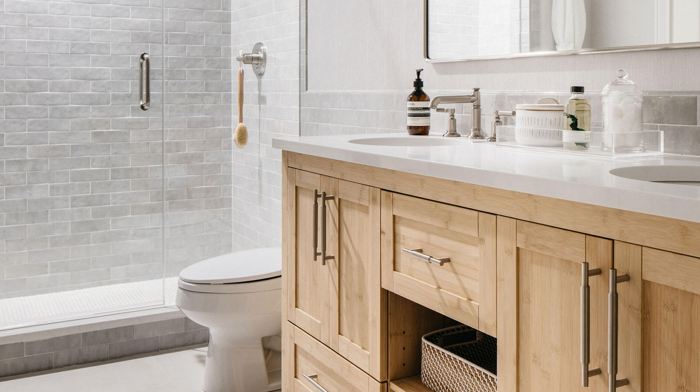 In the Guest Bathroom and Wet Bar, minimalism meets warmth and character. The Guest Bath is all about balance—cool gray tiles are offset by a light wood vanity and polished nickel fixtures, giving the space a fresh yet grounded feel. Meanwhile, the Wet Bar brings an unexpected pop of personality: custom millwork surrounds a back-painted vibrant blue glass tile backsplash, accented with illuminated glass cabinetry and a decorative wallpaper by Hunt Slonem. All of these elements came together to showcase the client’s love of beautifully styled glassware and bespoke spirits.
