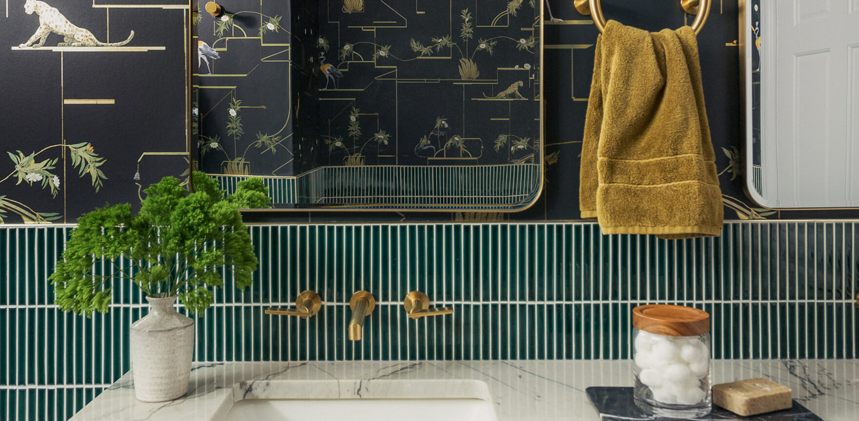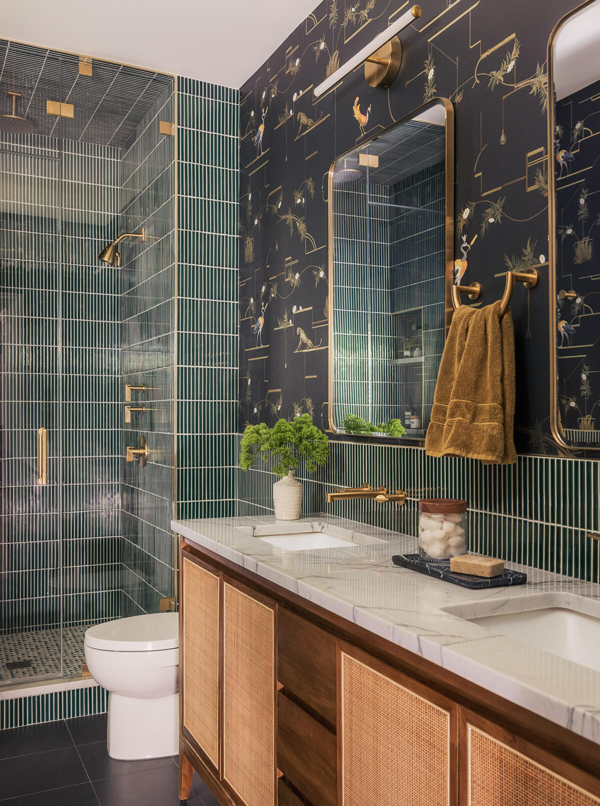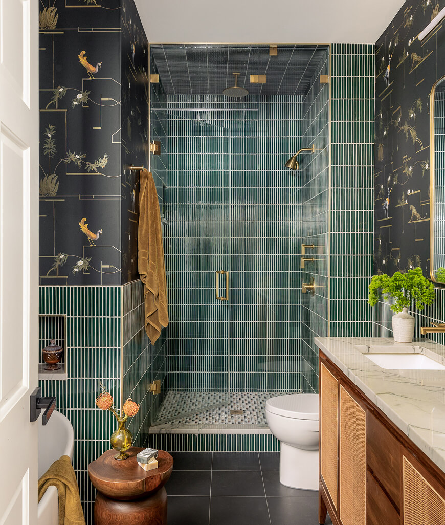 At the heart of the transformation is a bold Jennifer Shorto vinyl wallpaper—equal parts maximalist and practical—paired with green mosaic tile that envelopes the room, balancing drama with durability. This thoughtful combination of performance materials and playful design creates a space that feels both elevated and expressive. With its nods to global inspiration and Mid-century style, the final design is a joyful and deeply personal interpretation of modern luxury.