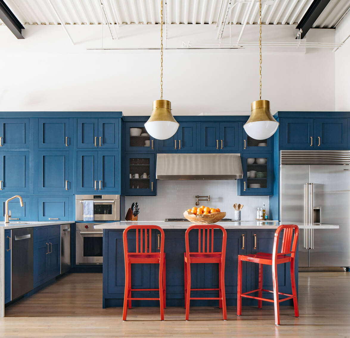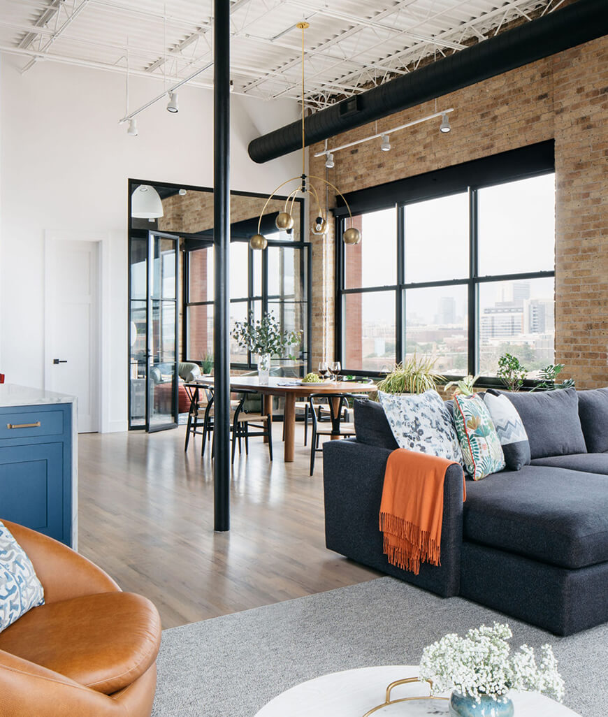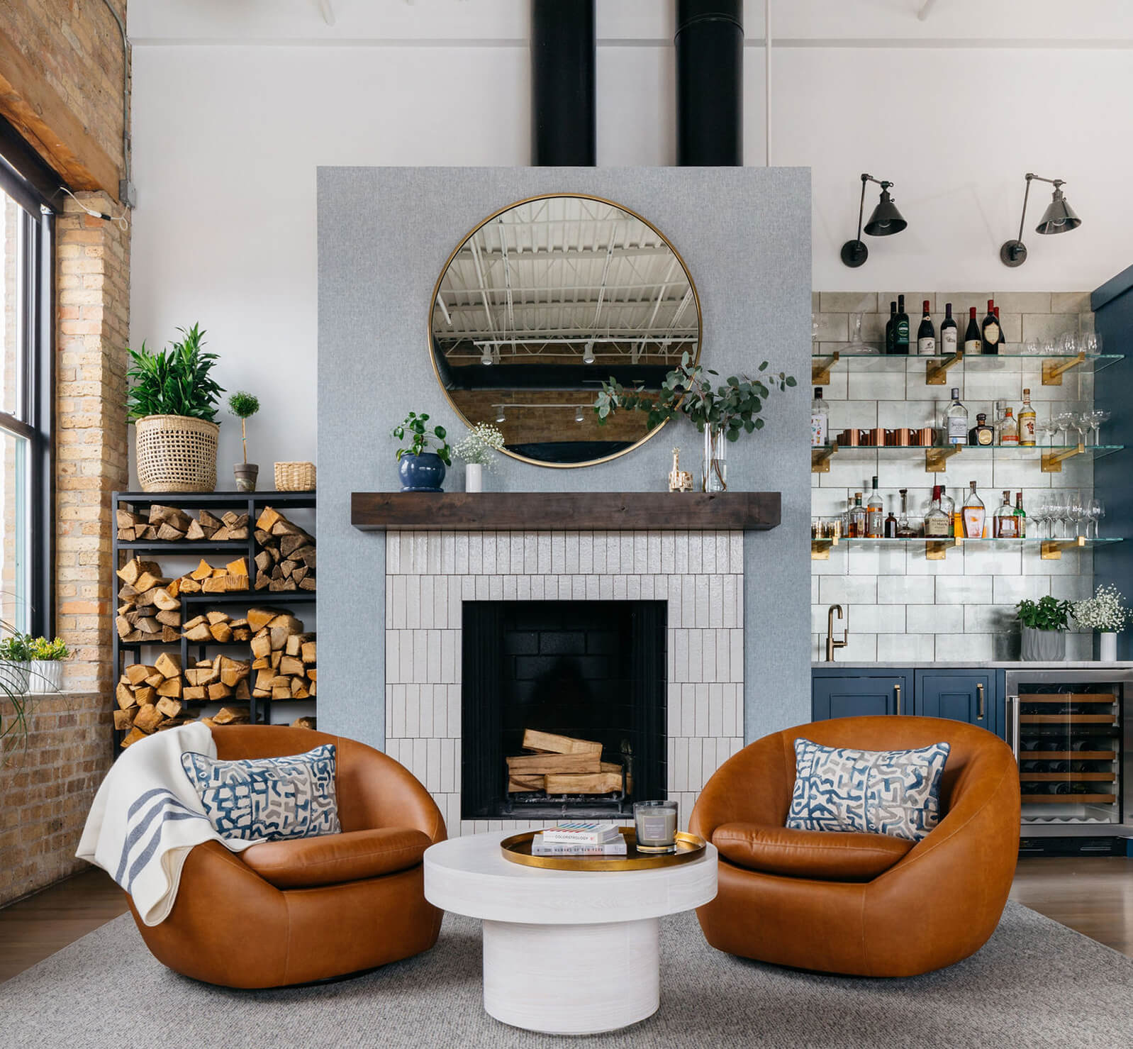 Every inch of the home was thoughtfully considered. From the double-entry glass doors that lead into a cozy guest lounge, to the playful powder room wrapped in leafy green wallpaper and a black-painted ceiling, each space tells its own story. The kitchen became a standout with its vibrant blue cabinetry, appliance garage, and dedicated wet bar, while the living and dining areas offer comfy, curated zones for entertaining and family time. In the primary bathroom, a deep-blue tiled nook frames the soaking tub beneath a sloped ceiling—an optical illusion that draws the eye and creates a true spa moment. Meanwhile, the children’s nursery softens the loft’s edges with gentle greens and plush textures, and the multi-use office/fitness room—with its clever dividing wall and hanging boxing bag—reflects the creative energy of the homeowners. Thoughtful storage, bold finishes, and a touch of whimsy make this home as hardworking as it is joyful.