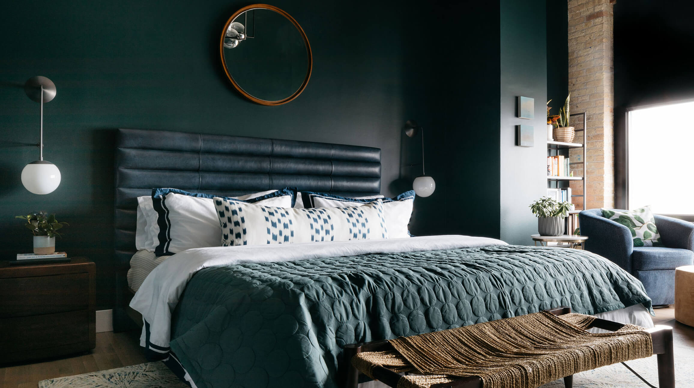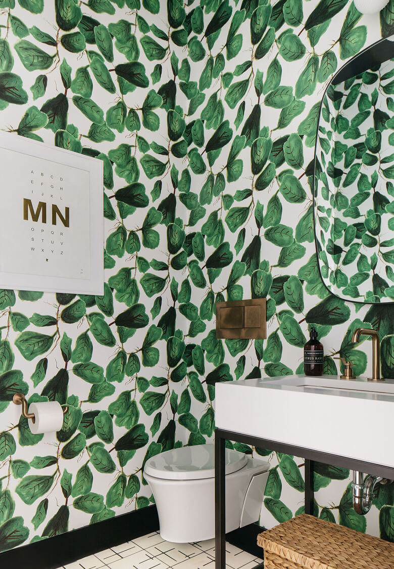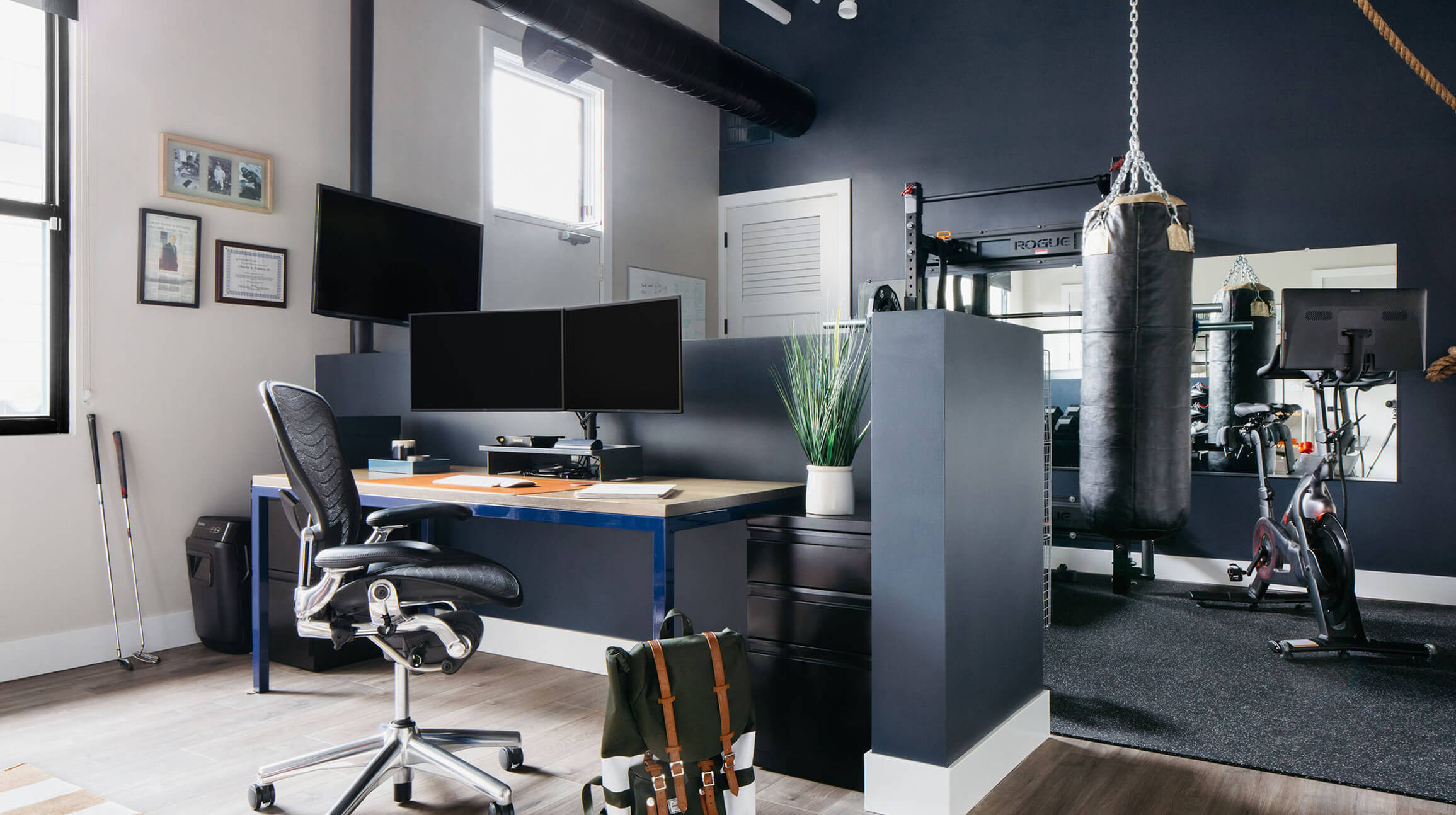 Every inch of the home was thoughtfully considered. From the double-entry glass doors that lead into a cozy guest lounge, to the playful powder room wrapped in leafy green wallpaper and a black-painted ceiling, each space tells its own story. The kitchen became a standout with its vibrant blue cabinetry, appliance garage, and dedicated wet bar, while the living and dining areas offer comfy, curated zones for entertaining and family time. In the primary bathroom, a deep-blue tiled nook frames the soaking tub beneath a sloped ceiling—an optical illusion that draws the eye and creates a true spa moment. Meanwhile, the children’s nursery softens the loft’s edges with gentle greens and plush textures, and the multi-use office/fitness room—with its clever dividing wall and hanging boxing bag—reflects the creative energy of the homeowners. Thoughtful storage, bold finishes, and a touch of whimsy make this home as hardworking as it is joyful.