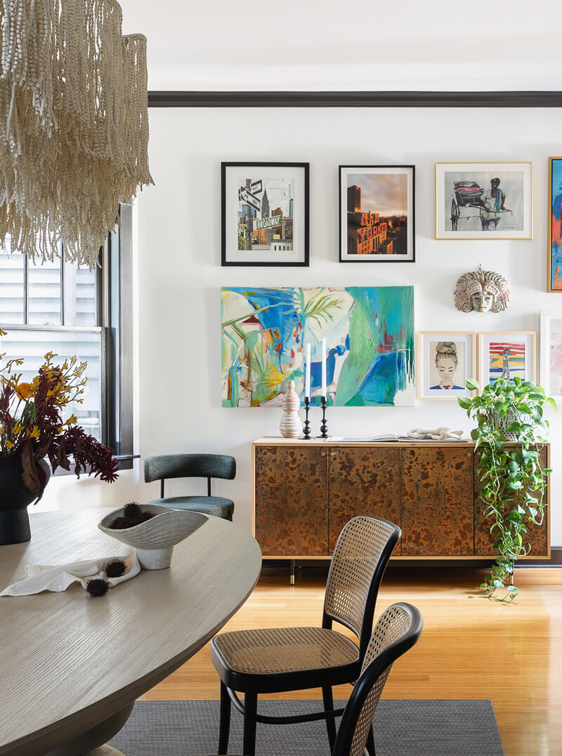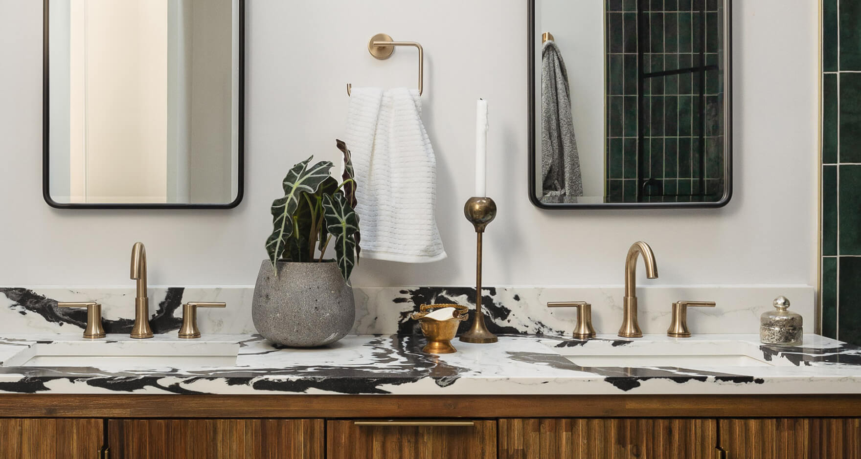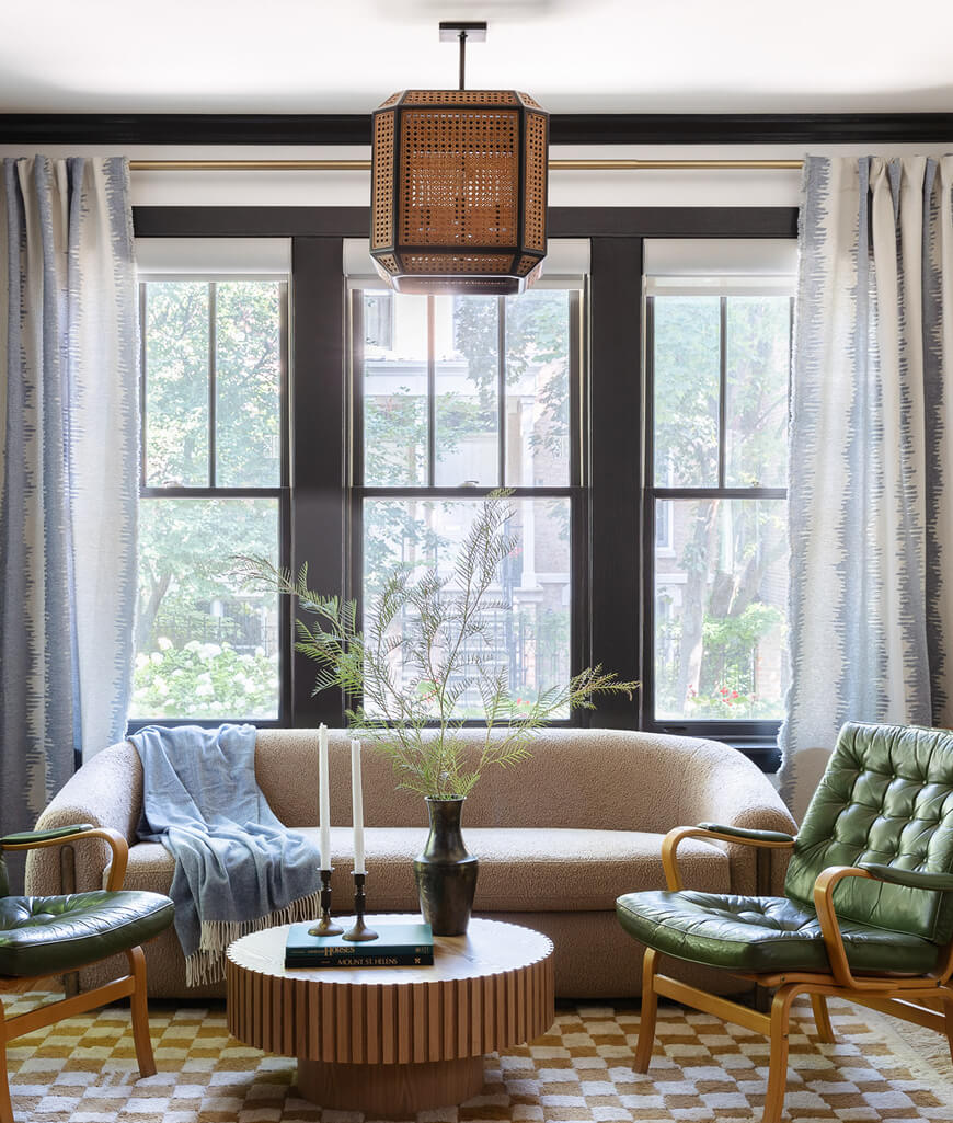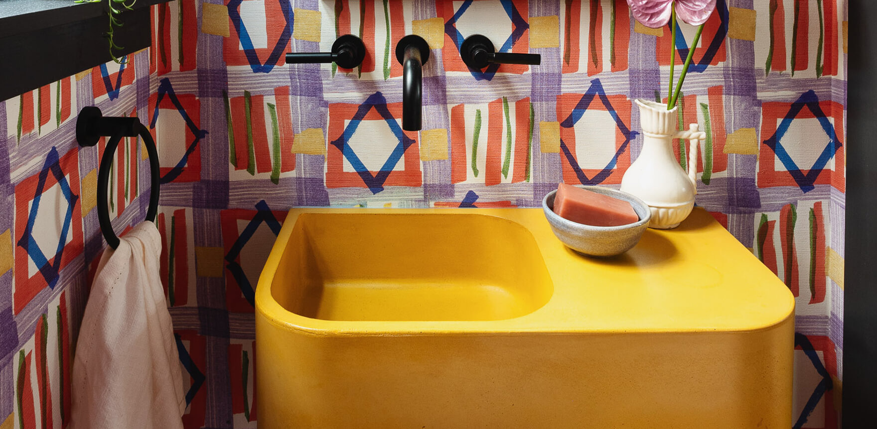 Throughout the home, layers of texture and whimsy bring every space to life. The powder room is a standout moment, featuring bold wallpaper, a yellow concrete sink, and playful green pendant lighting. In the kitchen, coordinating outlet covers blend into a textured tile backsplash, while bold wallpaper and stone pendants add just the right edge. The guest bathroom embraces fun with teal tiles and a compact custom vanity, and the primary bath is a jewel-toned retreat with a reconfigured layout that makes space for a soaking tub, walk-in shower, and eye-catching finishes. This project is a love letter to bold choices and thoughtful functionality—perfect for a family that lives colorfully.