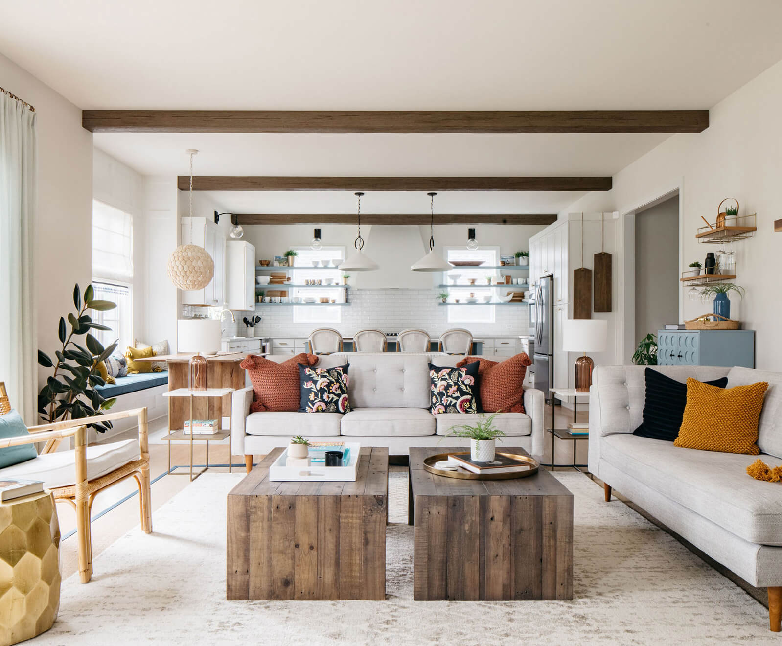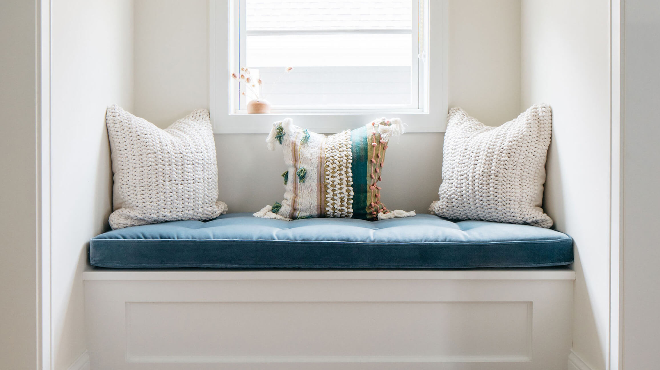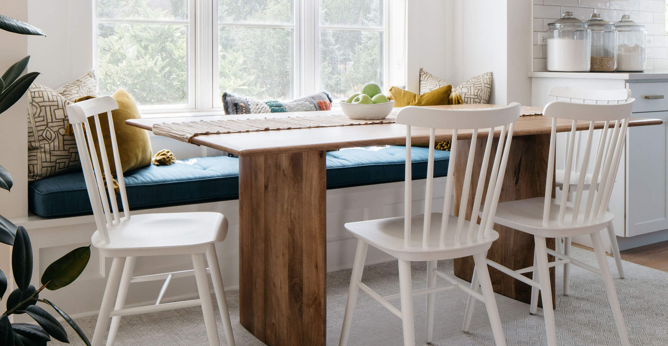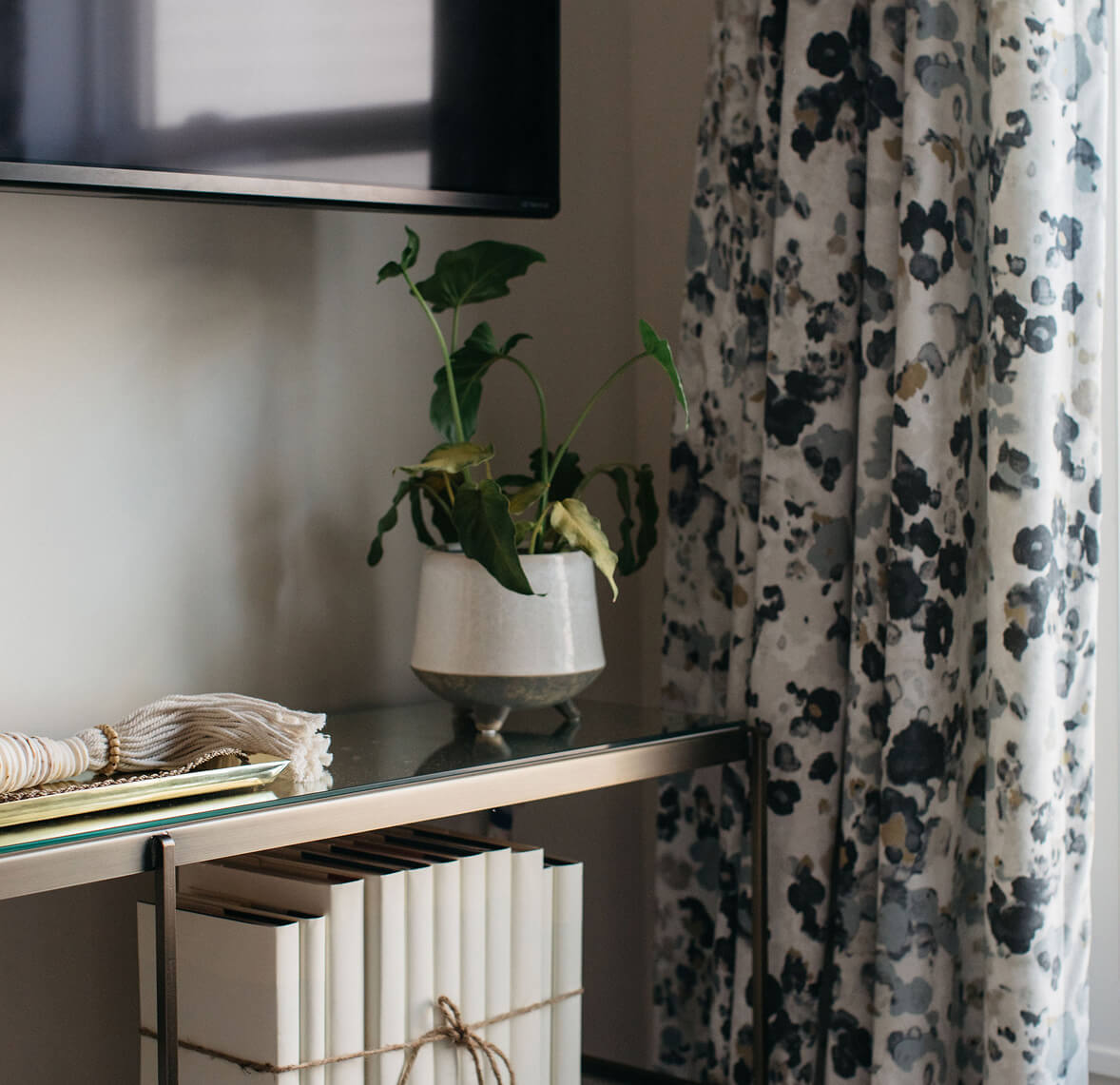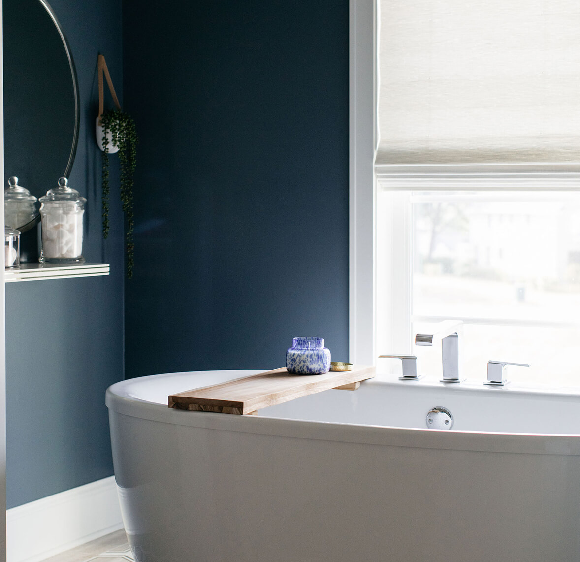 Touches of personality and coziness show up in every corner—from the creamy boucle reading chairs beside a sconce-lit window nook to the nursery’s teal wainscoting and playful polka dot rug. In the primary bedroom, a reclaimed wood headboard wall sets a calm and grounded tone, while deep teal and white accents mirror the soothing palette throughout. The primary bathroom becomes a spa-like retreat, featuring a freestanding soaking tub surrounded by a dramatic teal—the accent color’s most memorable moment. A dressing room with soft pink hues, feminine details, and dedicated handbag and wig storage rounds out this chic, family-friendly home with equal parts polish and personal flair.
