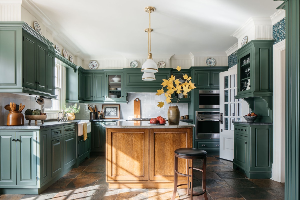 Tribbett revamped the existing buttercream-finish on the cabinets in a country home in Barrington, Illinois, by painting them Benjamin Moore's Boreal Forest. "That one took a little while to land on," she said, in part because of the slate floors and William Morris wall-covering. "I kind of told [my client] we had to lean in, and Boreal Forest had the right combination of bluey green that kind of bridged all of the different materials that we had going on in that space."